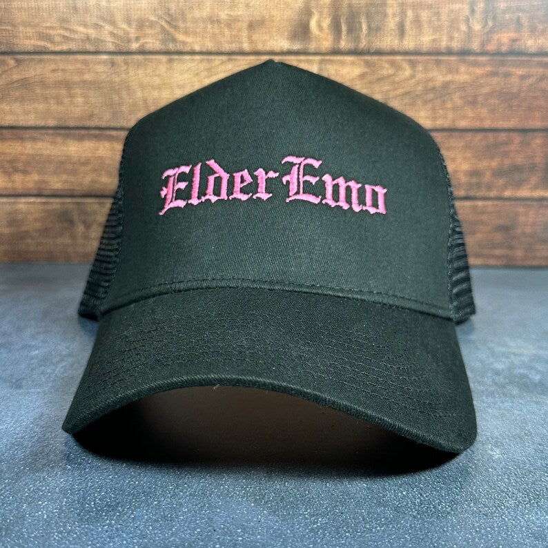 Take a trip back in time to the prime era of emo music with our Elder Emo Vintage Style Embroidered Trucker Hat. This hat is the perfect accessory for those who want to rock their emo spirit. Featuring a beautifully captivating gothic script "Elder Emo" logo, this hat is a must-have for any elder emo enthusiast. Whether you're looking for an emo inspired gift or wanting to make known your great love for the emo subculture, this gothic hat is the ultimate statement piece. Attending the When We Were Young Festival? Wear this hat proudly to the event or any other concert/festival, and let the world know that your emo spirit was never just a phase; it's a way of life. Embrace the emo culture with our Elder Emo Hat and show the world that emo is forever!
